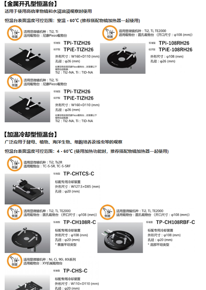 顯微鏡品牌及類(lèi)型 | 可選擇的標(biāo)準(zhǔn)型恒溫臺(tái)型號(hào) | ||