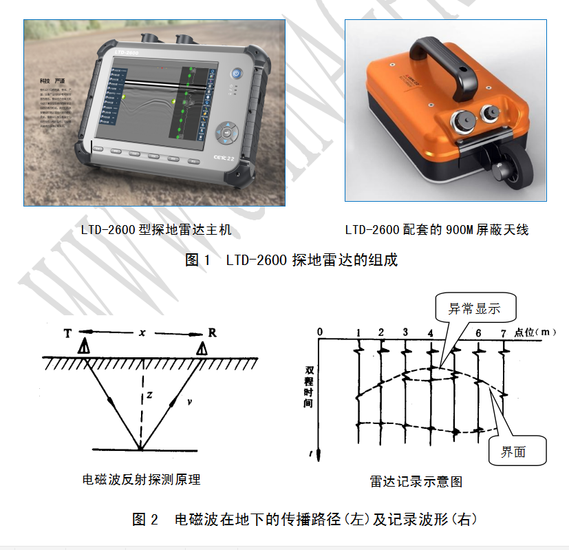 LTD探地雷達由一體化主機、天線及相關(guān)配件組成(圖1)。針對探地雷達所用的高頻電磁脈沖而言,通常工程檢測和勘探中所遇到的介質(zhì)都是以位移電流為主的低損耗介質(zhì)。在這類介質(zhì)中,反射系數(shù)和波速主要取決于介質(zhì)的介電常數(shù)ε,空氣的相對介電常數(shù)為1,最小;水的相對介電常數(shù)為81,最大。雷達工作時,向地下介質(zhì)發(fā)射高頻電磁脈沖(幾十兆赫至上千兆赫),電磁脈沖遇到不同電性介質(zhì)的分界面時即產(chǎn)生反射或散射,探地雷達接收并記錄這些信號,再通過進一步的信號處理和解釋即可了解地下介質(zhì)的情況。
