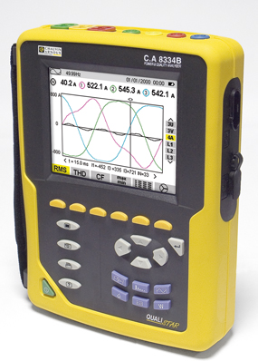 CA8334B(Qualistar)是法國CA公司最早推出的一款三相電能質(zhì)量分析儀,首度采用彩色液晶屏、實(shí)時(shí)電壓/電流波形、相位、諧波條形圖等顯示及操作簡便的人機(jī)界面,使其成為電能質(zhì)量分析儀的經(jīng)典之作,也是其他廠家競相模仿的機(jī)型。具有3路電流鉗輸入接口(可測 ABC三相電流,中性線電流由程序自動(dòng)計(jì)算顯示),4路電壓輸入接口(可測ABC三相的線電壓及相電壓),適用于各行業(yè)電力系統(tǒng)供用電的電能質(zhì)量測量、診斷與分析。