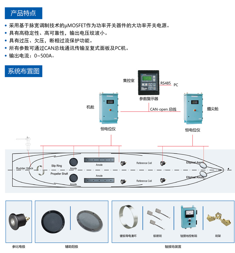- Product description: 外加電流陰極保護裝置是為了使浸沒于水中的外部船體免受腐蝕而設(shè)計的。本套裝置經(jīng)過精心設(shè)計、合適 的安裝,能夠有效地消除海水對船體、舵和螺旋槳(推進器)的腐蝕。外加電流陰極保護裝置可以大量減少犧 牲陽極的數(shù)量,降低維護成本和塢修工作量。