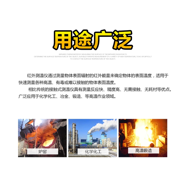 利用紅外測(cè)溫原理,可實(shí)現(xiàn)對(duì)物體進(jìn)行非接觸式的準(zhǔn)確溫度測(cè)量,具有距離系數(shù)大、響應(yīng)速度快、靈敏度高、準(zhǔn)確度高和測(cè)溫范圍廣的優(yōu)點(diǎn),在測(cè)量運(yùn)動(dòng)物體和難以接近的物體的溫度方面得到了很好的應(yīng)用。同時(shí)儀器具有輻射率調(diào)整、℉/℃轉(zhuǎn)換、/溫差測(cè)溫和上/下限溫度設(shè)置及超限聲光報(bào)警等功能,且儀器體積小、重量輕、操作簡(jiǎn)單、使用可靠。可廣泛應(yīng)用于石油、化工、鐵路、醫(yī)藥、電力、冶金、紡織、塑料、金屬加工、節(jié)能等行業(yè)快速非接觸的測(cè)量物體的溫度。